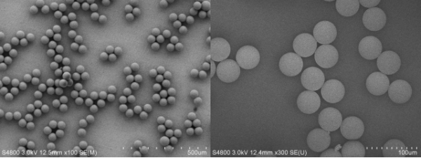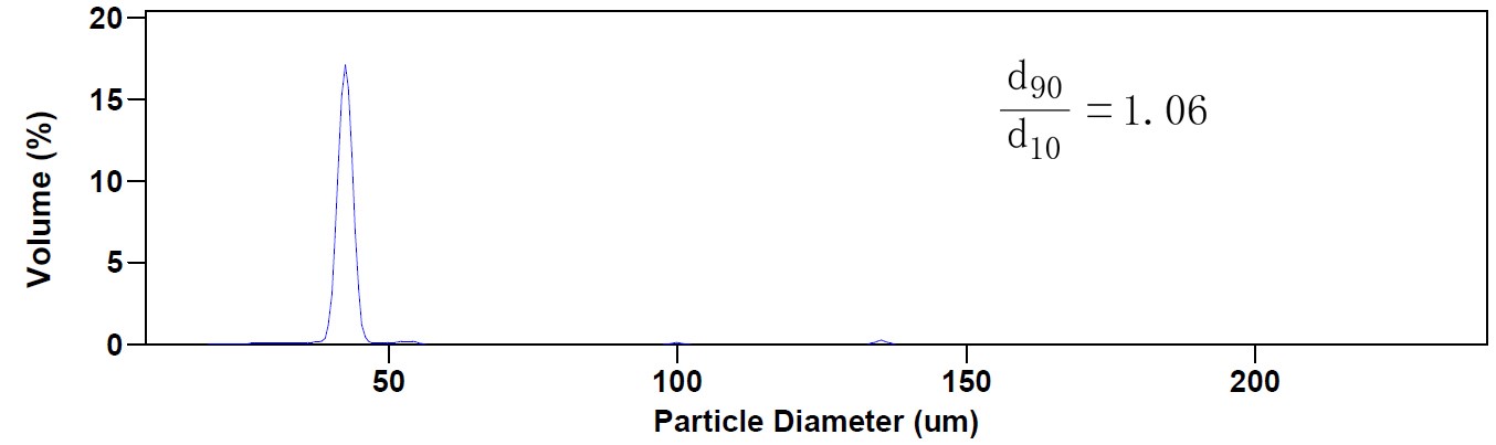 (1)均一的粒径分布:微球高度交联、表面光滑、高度球形。粒径为45μm,且分布较窄,D90/D10≤1.3。均一的粒径产生更稳定的柱床,节省填装色谱柱的时间。