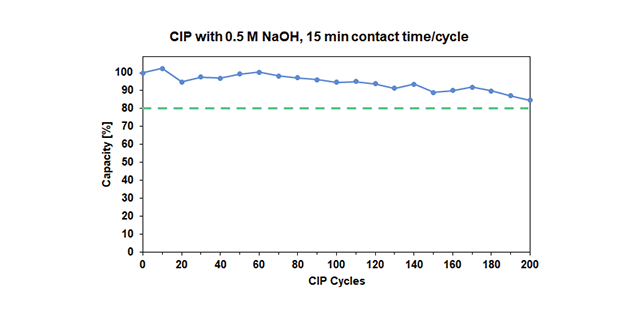 MabPurix P45在耐碱实验中使用 0.5 M NaOH CIP,200 次后 DBC 依然保持在初始 DBC 的 80% 以上。